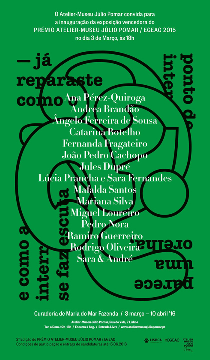 07.03.2016Catarina Botelho participa en "já reparaste como um ponto de interrogação parece uma orelha e, como a interrogação se faz escuta? - Um museu-atelier no Atelier-Museu Júlio Pomar", la exposición colectiva comisariada por Maria do Mar Fazenda para el Atelier-Museu Júlio Pomar (Lisboa). En ella participan también otros artistas como: Ana Pérez-Quiroga, Andrea Brandão, Ângelo Ferreira de Sousa, Fernanda Fragateiro, João Pedro Cachopo, Jules Dupré, Lúcia Prancha e Sara Fernandes, Mafalda Santos, Mariana Silva, Miguel Loureiro, Pedro Nora, Ramiro Guerreiro, Rodrigo Oliveira, Sara & André. “já reparaste como um ponto de interrogação parece uma orelha e, como a interrogação se faz escuta? - Um museu-atelier no Atelier-Museu Júlio Pomar” Del 3 de marzo al 10 de abril de 2016 Atelier-Museu Júlio Pomar Rua do Vale, 7 Lisboa Horario: de martes a domingo, de 10h a 18h.