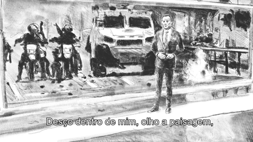 Legendado (Mudez) gathers images of the opening of a news program overlapped to the poem Mudez of Miguel Torga.